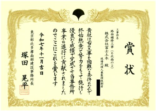 | 表彰名 | 東京都北多摩南部建設事務所長表彰 |